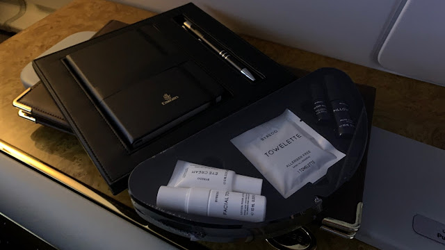 She came back shortly after with a bag containing the pyjamas, the male amenity kit and slippers. The first class amenity kit consisted of a 50ml shaving foam and razor by British company Gentlemen´s Tonic, a comb, a pack of tissues, a dental kit, a 35ml deodorant spray from Lynx and my favorite Bulgari products (a 40ml after-shave balm, lip balm, cleansing towel, a 40ml body emulsion and a 30ml perfume bottle Bulgari Le Gemme Tygar Eau De Parfum). I have always thought that the first class amenity kit of Emirates is one of the best there is 👍