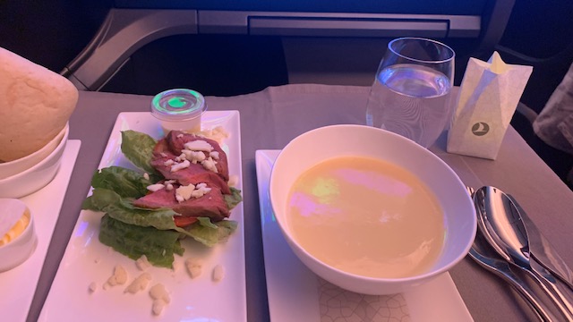I chose the Caesar beef salad and the creamy corn soup, both of which were very good.